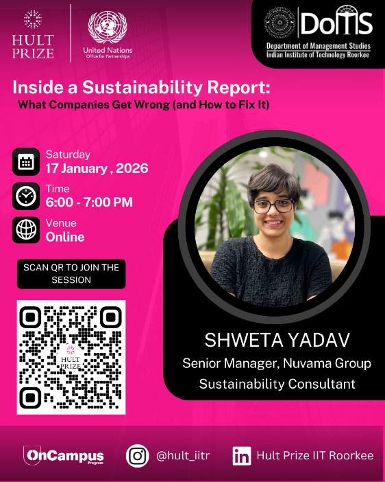 On January 17, 2026, sustainability expert Shweta Yadav, Senior Manager at Nuvama Group and Sustainability Consultant, delivered an online guest lecture titled “Inside a Sustainability Report: What Companies Get Wrong (and How to Fix It)”. The session offered participants a sharp, insider look at how organizations approach and often mishandle sustainability reporting, and what truly impactful, SDG-aligned thinking looks like in practice. It was an eye-opening session that helped teams sharpen the sustainability angle of their ideas.